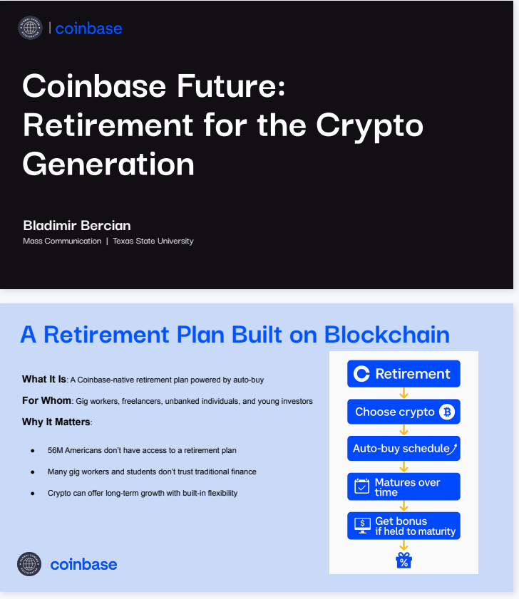 Proposed an innovative feature expansion for Coinbase, integrating retirement investment with crypto auto-buy options. This work sample showcases creative problem-solving and strategic thinking for tech-oriented markets.