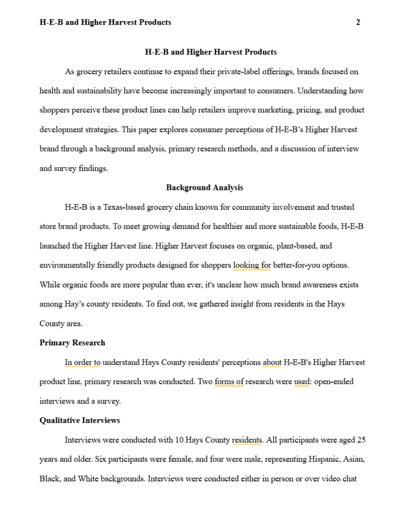 Conducted a full 10-page product line analysis for H-E-B’s Higher Harvest brand, combining research data and consumer insights to recommend marketing strategies. This demonstrates my analytical and reporting skills.